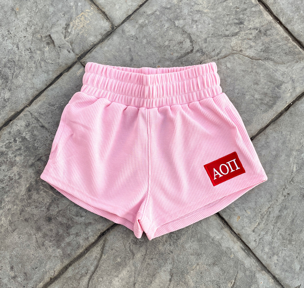 The perfect lounge shorts in pink thermal waffle material. The are perfectly high waisted with extra room to not fit tight.