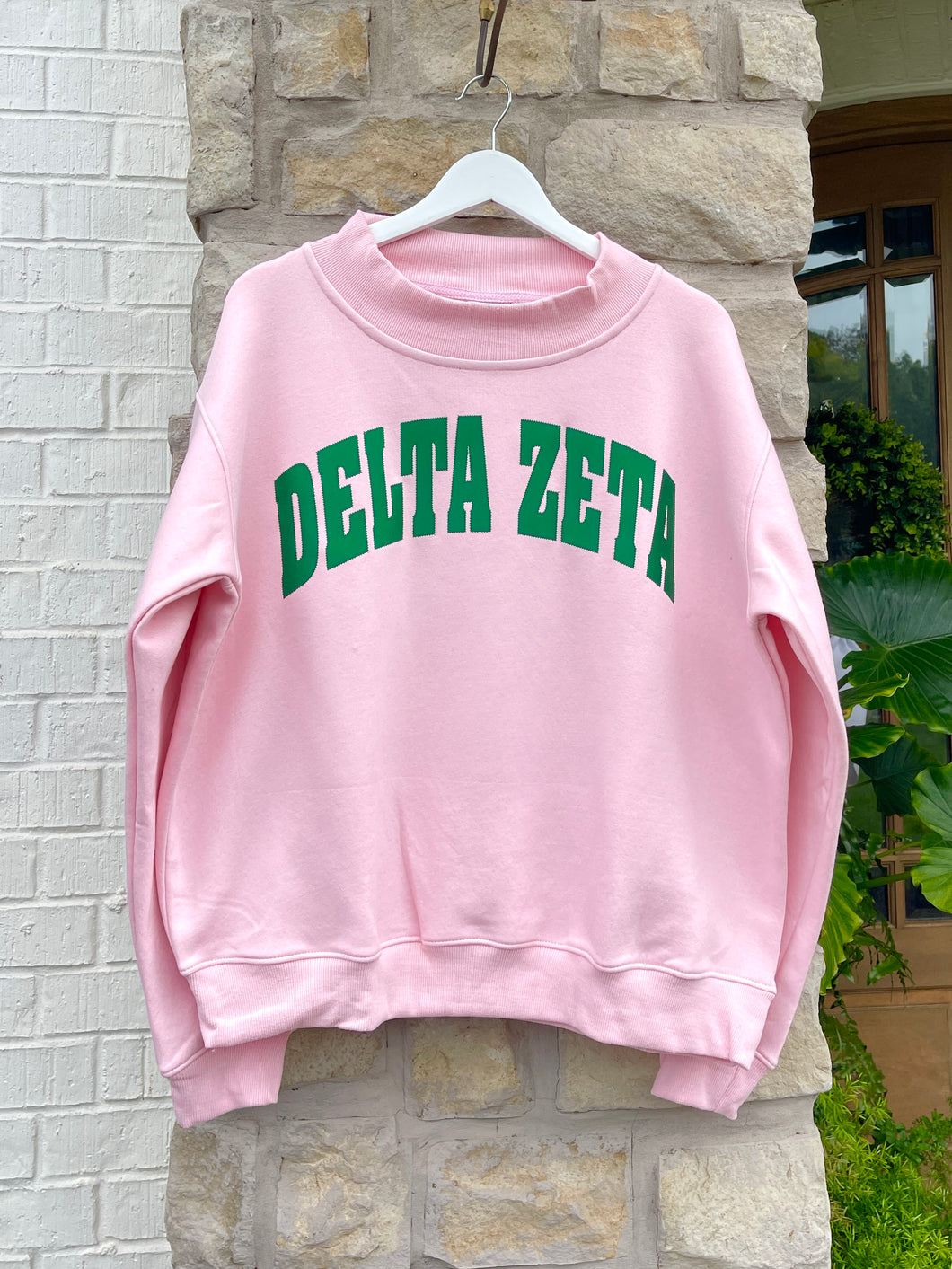 The letters are sim stitch and have been heat applied. The Letters are green on the pink sweatshirt.