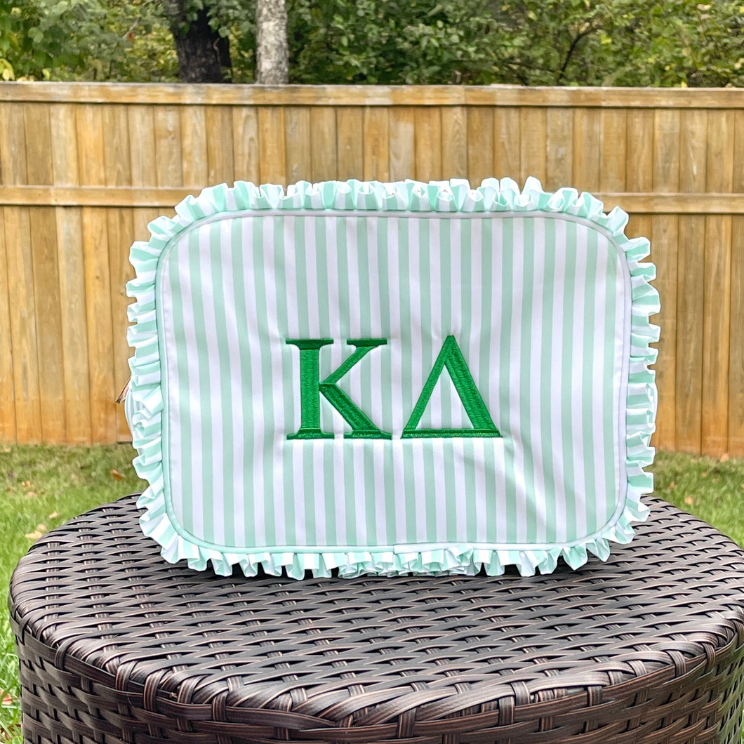 Kappa Delta Green Stripe Ruffle cosmetic bag.  The perfect gift for any new member.  Great for makeup or skin care.