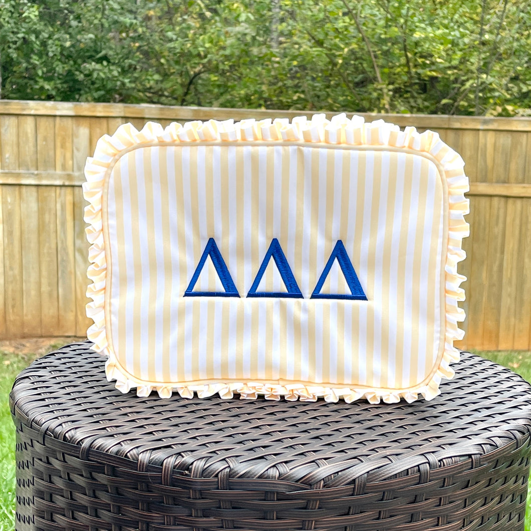 Tri Delta Yellow Stripe Ruffle cosmetic bag. The perfect gift for any new member. Great for makeup or skin care.
